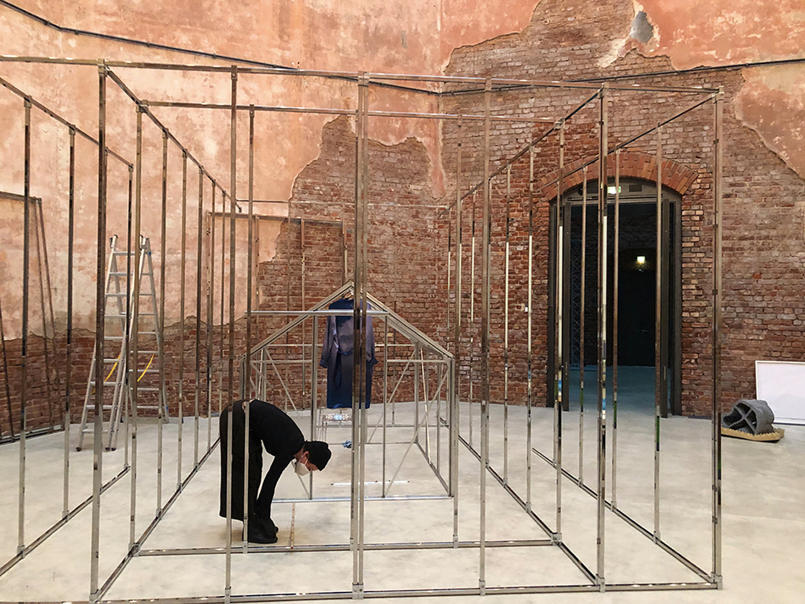 Die Künstlerin baut ihre Installation im Oktogon auf. Das Gerippe eines Gewächshauses mit Umgang steht bereits. Ich muss an Ulrich Schießl denken. Der frühere Rektor hat an eben dieser Stelle vor circa 15 Jahren zur Diplomeröffnung wie wild Schlagzeug getrommelt. Was für eine Party! Die Zitronenpresse bebte. Kommt das wieder? Die vergangene Diplompräsentation fand coronaverschoben im September statt. Hat sie jemand gesehen? Ich nicht. Hat der kommende Abschlussjahrgang mehr Chancen auf Öffentlichkeit? Wird diese Ausstellung jemand besuchen können?