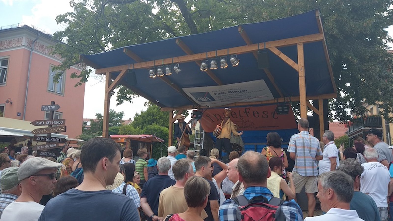 Mich führt die Straße nun zu meinem letzten Programmpunkt auf dem Inselfest. Im gut besuchten Breitengrad wird der Film „Versunken im Reich der Kmer“ von Michael Hloucal vorgeführt. In dem Raum mit allerlei Dingen zum Entdecken schauen viele Reiseinteressierte gebannt auf die Leinwand. Mal wird gelacht, mal mit dem Kopf geschüttelt und mal strömt von der Brauerei gegenüber ein Wirtshauslied durch die Tür. Am Ende wird mit einem Applaus Respekt an die Filmcrew gezollt und die Zuschauer zerstreuen sich in der Abendatmosphäre der Laubegaster Straßen. Auch ich laufe mit der Sonne auf der Schulter elbabwärts in Richtung Innenstadt und bedauere, dass ich mich das letzte Mal vom Inselfestwochenende verabschiede. Aber ich verkneife mir das „Lebwohl“ und hoffe auf ein „Auf Wiedersehen“!
