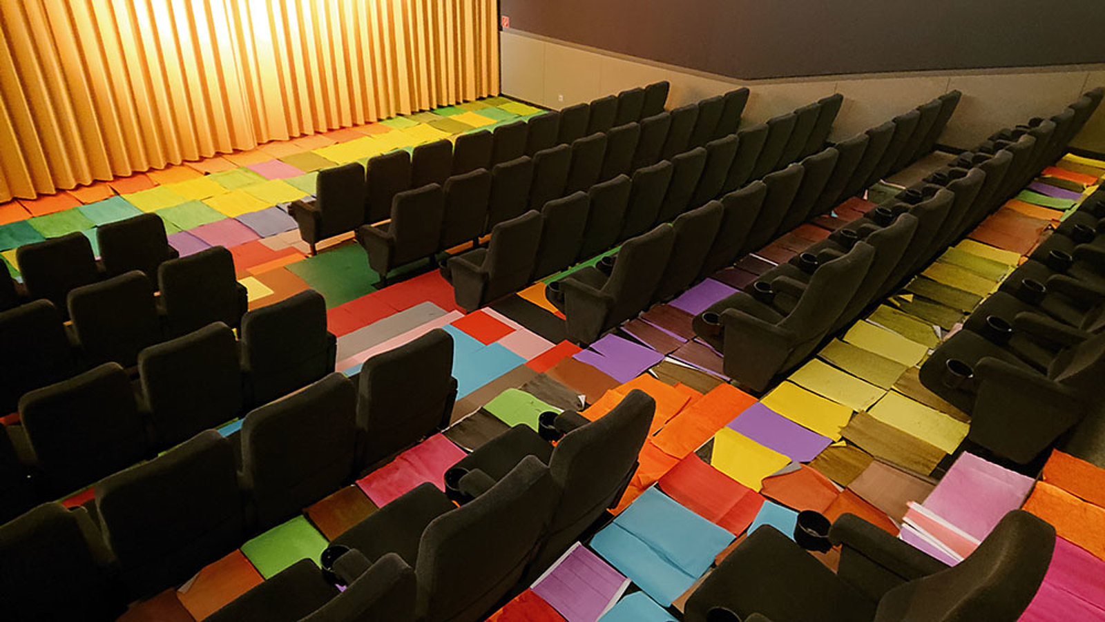 Das Programmkino Ost hat die Schließzeit übrigens nicht nur für die Technik-Aufrüstung genutzt, sondern Säle, Foyers und Außenschaukästen für eine inspirierende Kunstaktion zur Verfügung gestellt. Für seine temporäre Präsentation mit dem Titel »Intervention. Lost Places. Take Over.« »übernahm« der 1982 in Dresden geborene Felix Lippmann – der Mann ist nicht nur Künstler, sondern als Pauschalkraft im Backoffice quasi seit Jahren hier zu Hause – im März das Programmkino Ost und hauchte dem verwaisten Haus mit Blättern aus gefärbtem Papier für kurze Zeit neue Lebendigkeit ein. Mehr Fotos der Aktion gibt es auf den Homepages von Programmkino Ost und Felix Lippmann, in natura sind nur noch die Arbeiten in der Schaukastenfront des Kinos zu bewundern.