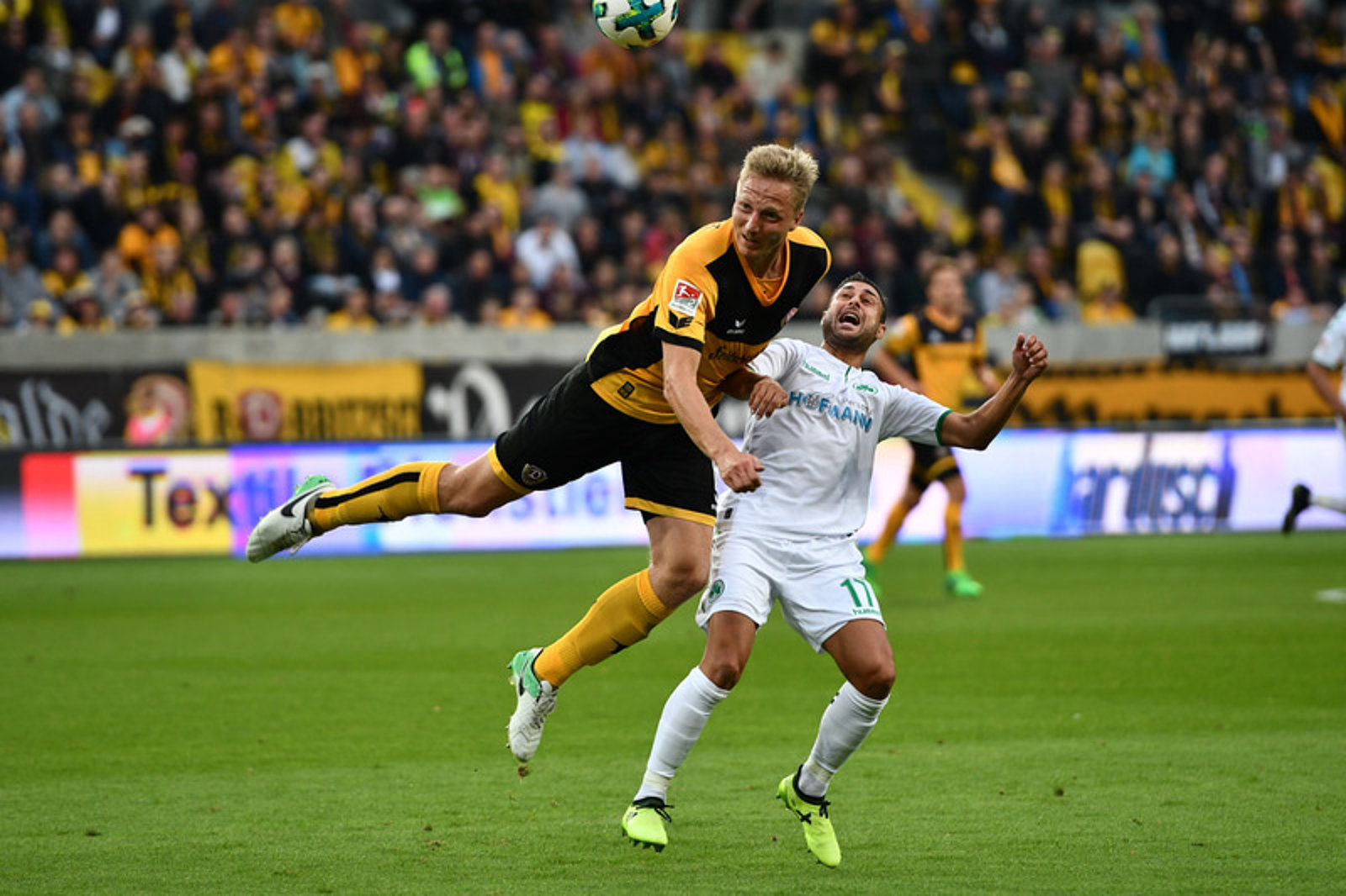 Nach knapp zehn Minuten meldete sich dann auch mal das Kleeblatt vor dem Schwäbekasten, Julian Green konnte aber einen halbseidenen Konter nur mit einem Schüsschen abschließen – keine Herausforderung für den SGD-Keeper. Nach einer reichlichen Viertelstunde zeigte dann Duljevic, warum er bei Dynamo sehr wichtig werden könnte: Nach einer furchtbar getretenen Greuther-Ecke narrt er den ersten Gegenspieler mit einer Drehung und bringt dann mit Spitze und körperlichem Einsatz den Ball zu Benatelli. Der geht über das ganze Feld, wird von Dulejvic wie ein D-Zug überholt und kann so vor dem Tor wieder angespielt werden – doch am Ende zappelt das Netz nur von außen. Wenig später muss Lucas Röser das Tor machen, als Benatelli ihm einen weiten Ball mit einer gekonnten Brust-Fuß-Komibination in den Fuß legt, aber satt sofort abzuziehen, zögert die Neun zu lange – vergeben und vertan die Chance.