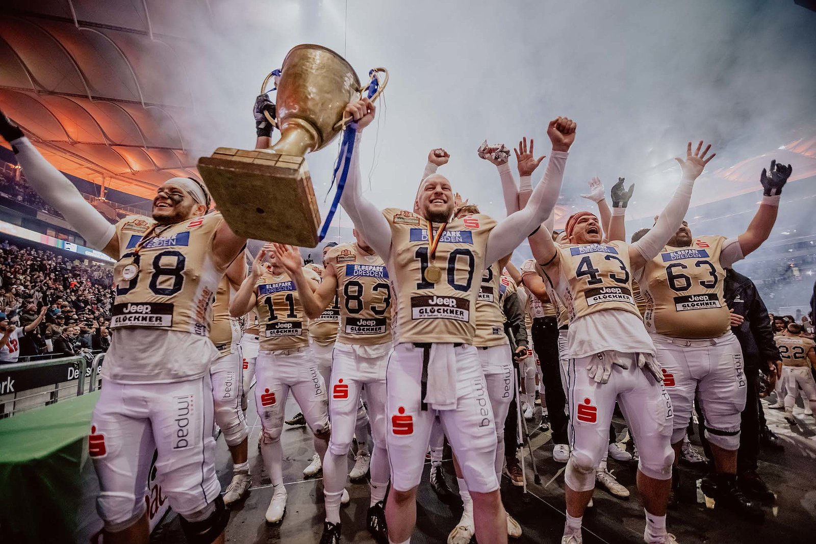 Die Spielbetriebsrückkehr an die Bärnsdorfer Straße sieht der Präsident durchaus als Herausforderung, aber auch als Erlebniszugewinn für die Fans. Eine erste Kostprobe gibt es bei einem Testspiel am 7. Mai. Das Highlight wird jedoch das Jubiläumsspiel zum Vereinsjubiläum, das die Footballer mal wieder ins Rudolf-Harbig-Stadion führen wird: Am 28. Mai geht es hier gegen die Kiel Baltic Hurricanes. Auf die kommende Saison blickt er derweil mit ruhiger, aber spürbarer Vorfreude: »Es wird etwas anders als Gejagter, aber wenn man den Pokal erst mal hat, ist man etwas entspannter.«