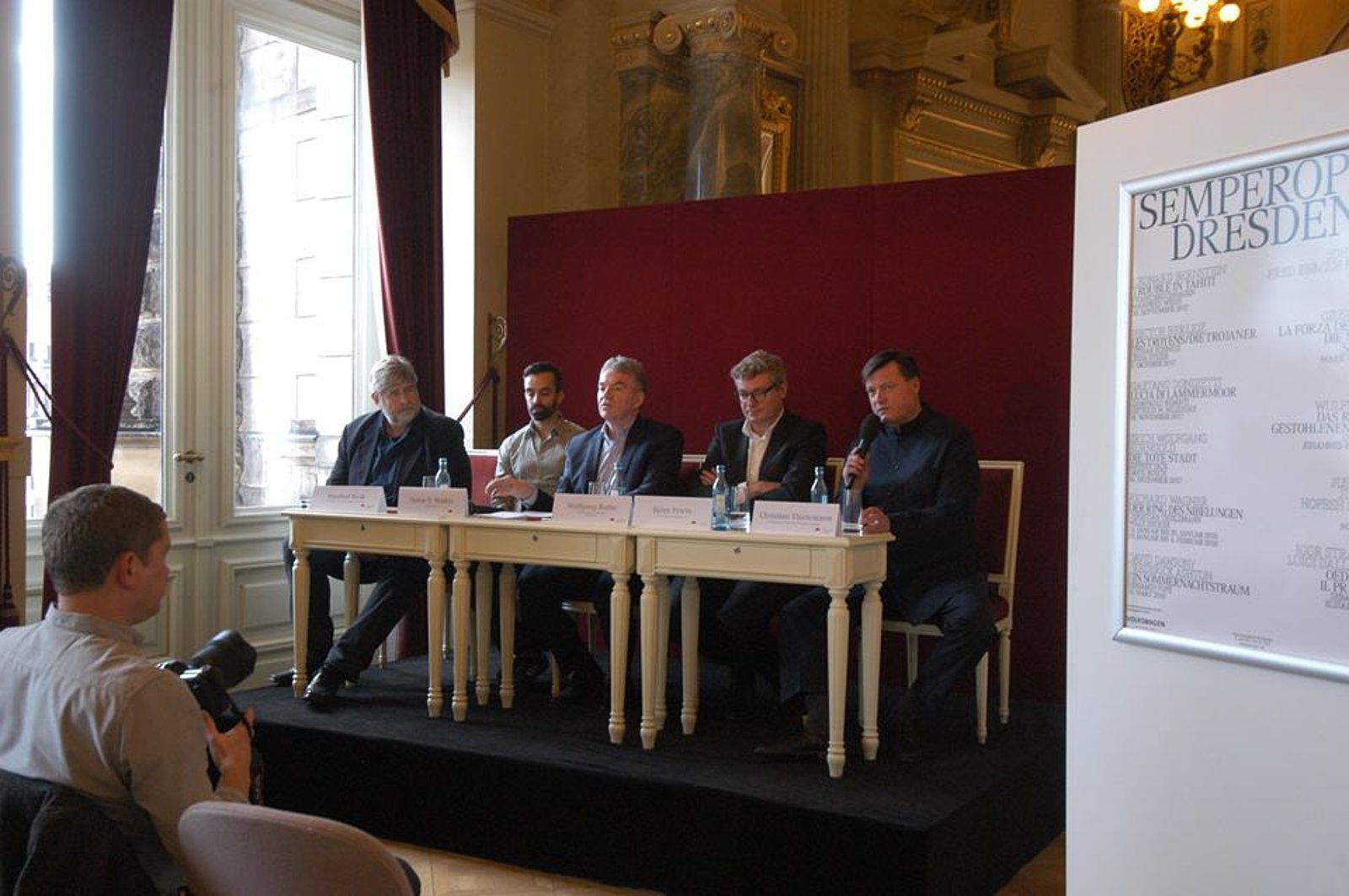 Das Pressegespräch vor nicht sehr dicht gefüllten Reihen der Medienvertreter endete mit einer Danksagung des Semperopernclubs an Wolfgang Rothe. Dieser befeuert nicht nur das Interesse der dort aktiven Theaterbesucher, sondern hält als Kaufmännischer Geschäftsführer und kommissarischer Intendant das Schiff Semperoper ein weiteres Jahr ohne Intendant auf Kurs. (Der „Neue“ Peter Theiler kommt erst 2018 an die Elbe.) Bevor er das Programm der Spielzeit 2017/2018 vorstellt, ergreift kurz Christian Thielemann als Chefdirigent der Staatskapelle das Wort. 15 Mal insgesamt wird er auch als Operndirigent in der nächsten Spielzeit in der Semperoper am Pult stehen. Die Vollendung der Wiederaufnahme des „Rings“ mit zwei Aufführungszyklen im Januar 2018 steht bevor und auch einige „Tosca“ Dirigate. Eigentlich zu wenig in der Oper, wie er selbst befindet, aber dem vollen Konzertspielplan und vielen Gastspielreisen geschuldet. Beste Connections bringt der Maestro von seinen Aktivitäten in Bayreuth oder durch die Kooperation mit den Salzburger Festspielen auch zukünftig wieder mit an sein Stammhaus.