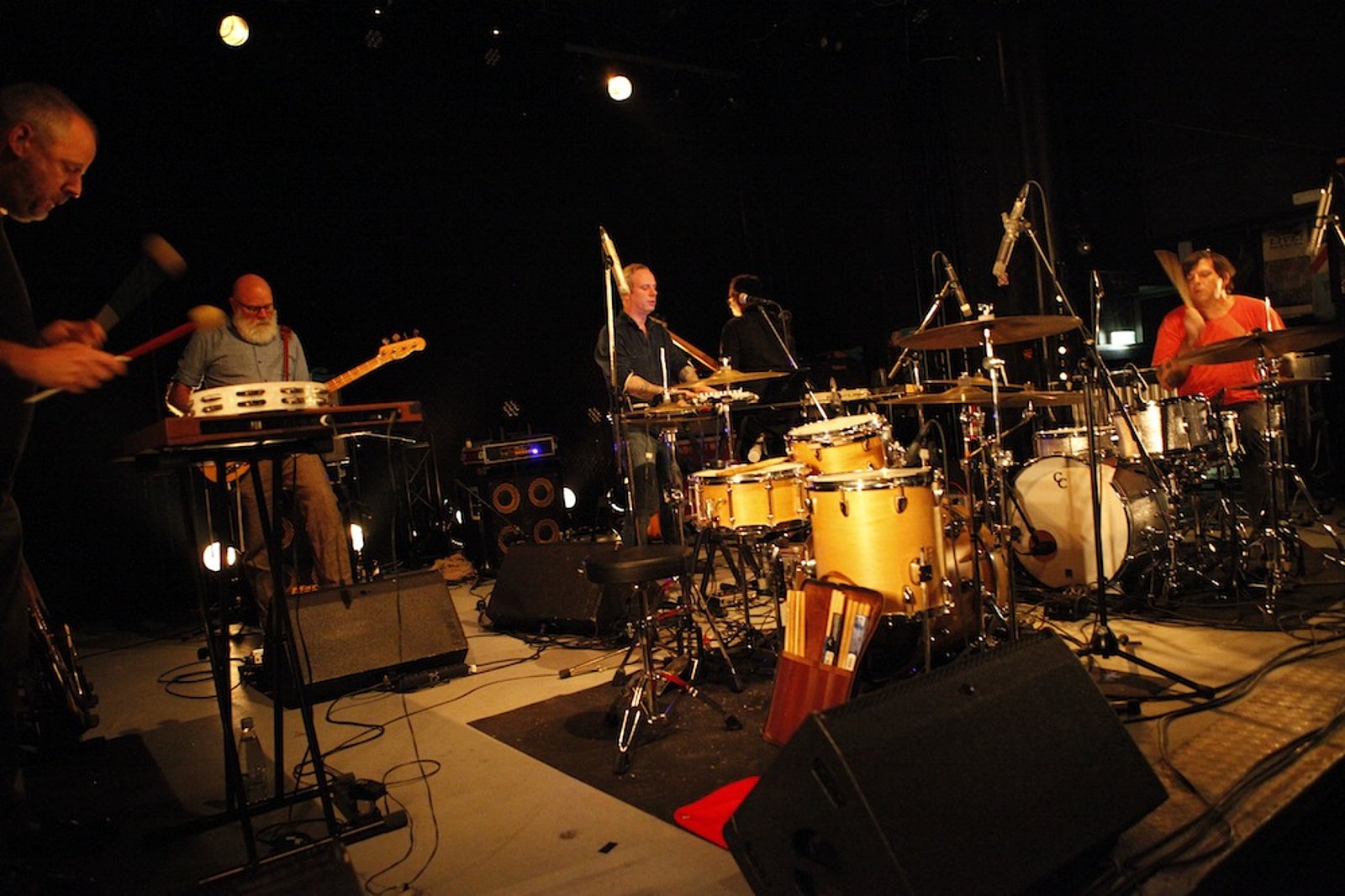 Die Musik steht bei den Amerikanern absolut im Mittelpunkt. Vorn am Bühnenrand, wo gewöhnlich der Sänger/ die Sängerin agiert, sind zwei Schlagzeugsets aufgebaut. Fast sah es so aus, als wollten sich die fünf Bandmitglieder regelrecht hinter ihrem Instrumentenpark verstecken, um in Ruhe ihrem Handwerk nachgehen zu können. Ein Chef, der als solcher erkennbar gewesen wäre, war nicht auszumachen. Mal ist es der eine, mal ein anderer, der das nächste Stück einzählt. Ständig werden reihum die Instrumente getauscht, ist der Bass plötzlich doppelt besetzt, wechseln die Schlagzeuger an diverse Keyboards oder Percussions. Das kollektive Musikmachen hat etwas Afrikanisches, die Musik fließt und fließt. Manchmal scheint ein Free Jazz-Riff der Gitarre auf, kurz darauf ein rätselhafter Elektrosound, ganz so, als hätten sie sich vorgenommen, dass es auf gar keinen Fall zwei Mal dieselbe Strasse runtergehen darf. Wie bei einem abstrakten Gemälde, das beim Betrachten ständig neue Facetten preisgibt, konnte man Tortoise zuhören, ohne dass Langeweile aufkommt. Gut gemacht, altes Schildkrötentier!