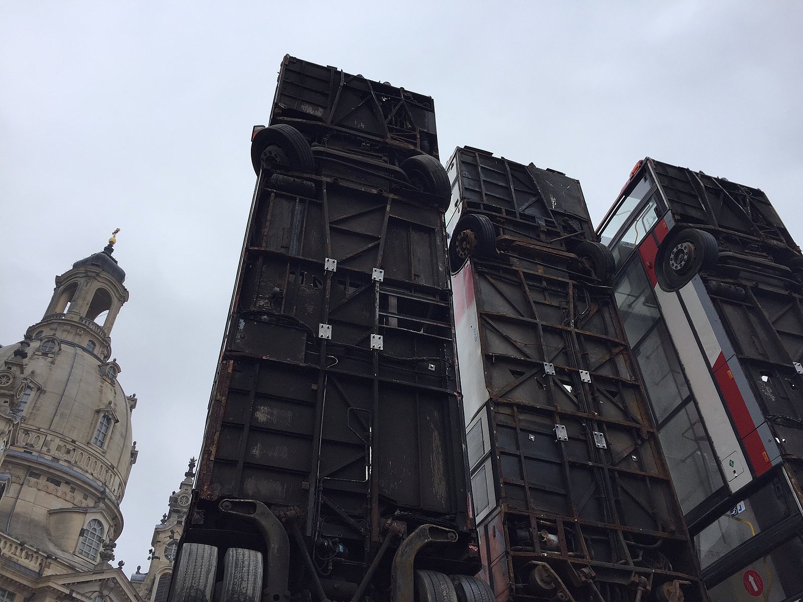 Da stehen sie nun auf dem Neumarkt. Die drei Busse. Dresden – Aleppo – Dresden. Ein hochkantiges Menetekel der Erinnerung an Krieg und Verderben vom Heute ins Gestern und zurück. Es ist genug darüber geschrieben worden, mit welcher Intention der Künstler Manaf Halbouni das Projekt geplant und umgesetzt hat. Nun geht es also an die Rezeption. (Liebe Pegis: Damit ist nicht ein Hotelempfang gemeint.) Und da konnte man sich bei der Eröffnung des Kunstwerkes am 7. Februar schon etwas kundig machen.