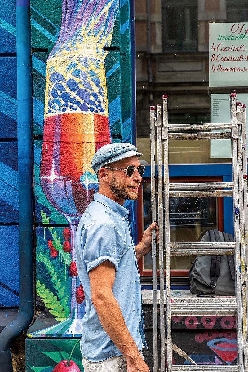Der nächste Auftrag, die werbewirksame Wandgestaltung eines Biergartens, wartet schon. Auch die Görlitzer Straße ist noch nicht ganz fertig. Es lohnt also, beim Neustadt-Flanieren die Augen offen zu halten – nach einem Mann auf einer Leiter, umgeben von zahllosen Farbbüchsen, den Pinsel gezückt, der Welt entrückt und tief in seiner Arbeit versunken …