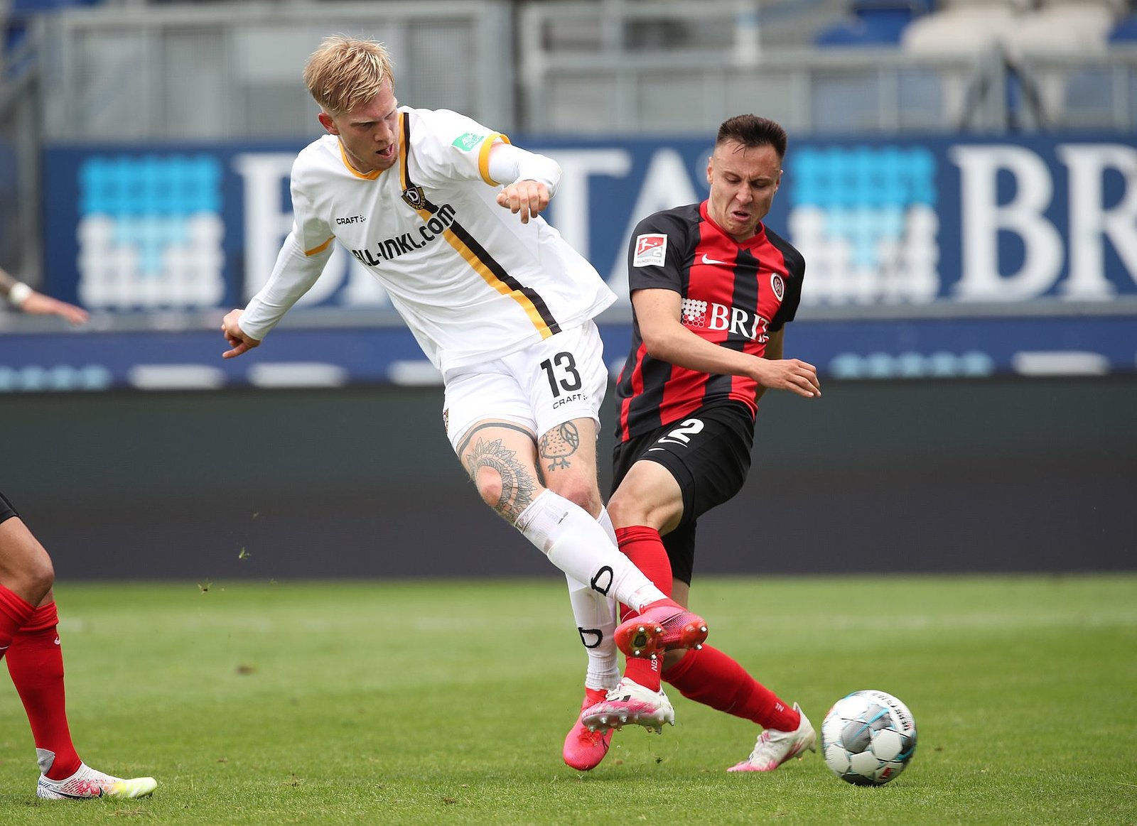 Gedacht, getan. Donyoh bekommt nur Sekunden später den Ball steil auf links, guckt nicht erst lange, sondern flankt mit Gottvertrauen einfach bogenlampig vor das Tor, wo Dominik Franke vollkommen ungedeckt vollstreckt. Nun mag niemand hektisch die Dresdner Aufstellung durchforsten, denn der arme Franke gehört natürlich zu den Rotschwarzen. Aber wie gekonnt er mit dem Arbeitsfuß vorbeisäbelt, um mit dem Standfuß einzunetzen – das hat schon was. Aber hey, ein Tor! Ein Tor! Der erste Corona-Geister-Treffer! Wer fragt da am nächsten Tag noch nach dem Werwiewarum? So kann es weitergehen! Noch ein Tor! Noch ein Tor!