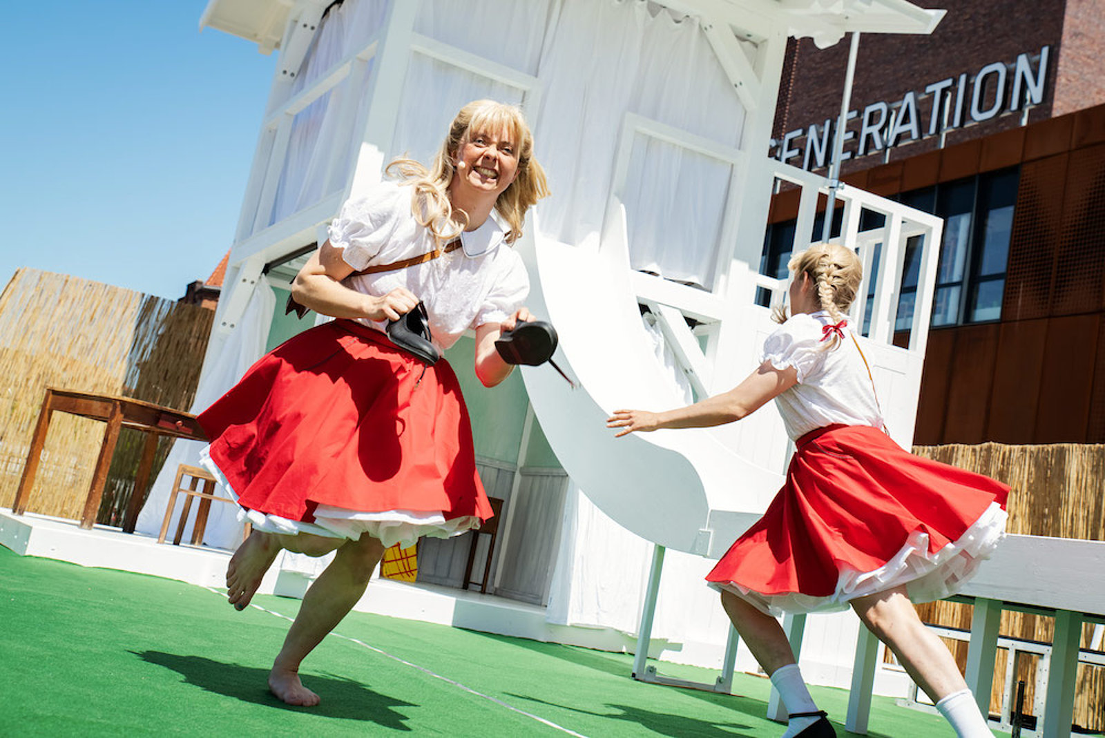 Endlich wieder Theater!, hieß es schon im Juni. Zum Glück ist Sommer, zum Glück müssen Freilichtbühnen nicht erst erfunden werden, zum Glück freuen sich sowohl die Theaterleute als auch das Publikum so darauf, endlich wieder beieinander zu sein, dass Abstand überall zwar vorbildlichst eingehalten, aber zur kleinen Nebensache wird. Vielmehr störte der Regen die Premiere des „Doppelten Lottchens“ auf der Freilichtbühne des Theaters Junge Generation im Kraftwerk Mitte. Denn auf der Bühne erinnert alles an Sommer, Sonne, Eis und See. Schließlich geht es in dieser heiter-melancholischen Verwechslungsgeschichte um Ferienlager. Bühnen- und Kostümbildnerin Nora Lau hat dafür eine luftig-weiße Sommerarchitektur geschaffen, rechts ein Eiskiosk, links ein Häuschen für die Ferienlagerleitung, aus dem eine Rutsche mitten ins Bühnengeschehen führt: mal zum Speisesaal, mal zum Schlafsaal und gleich zu Beginn zum besten Blick auf die „Neuen“, die im Ferienlager ankommen. Und dann steht Luise Palfy aus Wien plötzlich Lotte Körner aus München gegenüber, sie gleichen sich, als würden sie in den Spiegel schauen, als wären sie Walter Triers Illustrationen aus Erich Kästners berühmten Kinderbuch entstiegen. Aus Luises tiefer Abneigung zu ihrer Doppelgängerin wird schnell Freundschaft, die Mädchen begreifen, dass sie Zwillinge sind, sie beschließen, die Namen zu tauschen, die Rollen zu wechseln und den jeweils anderen Elternteil kennenzulernen.