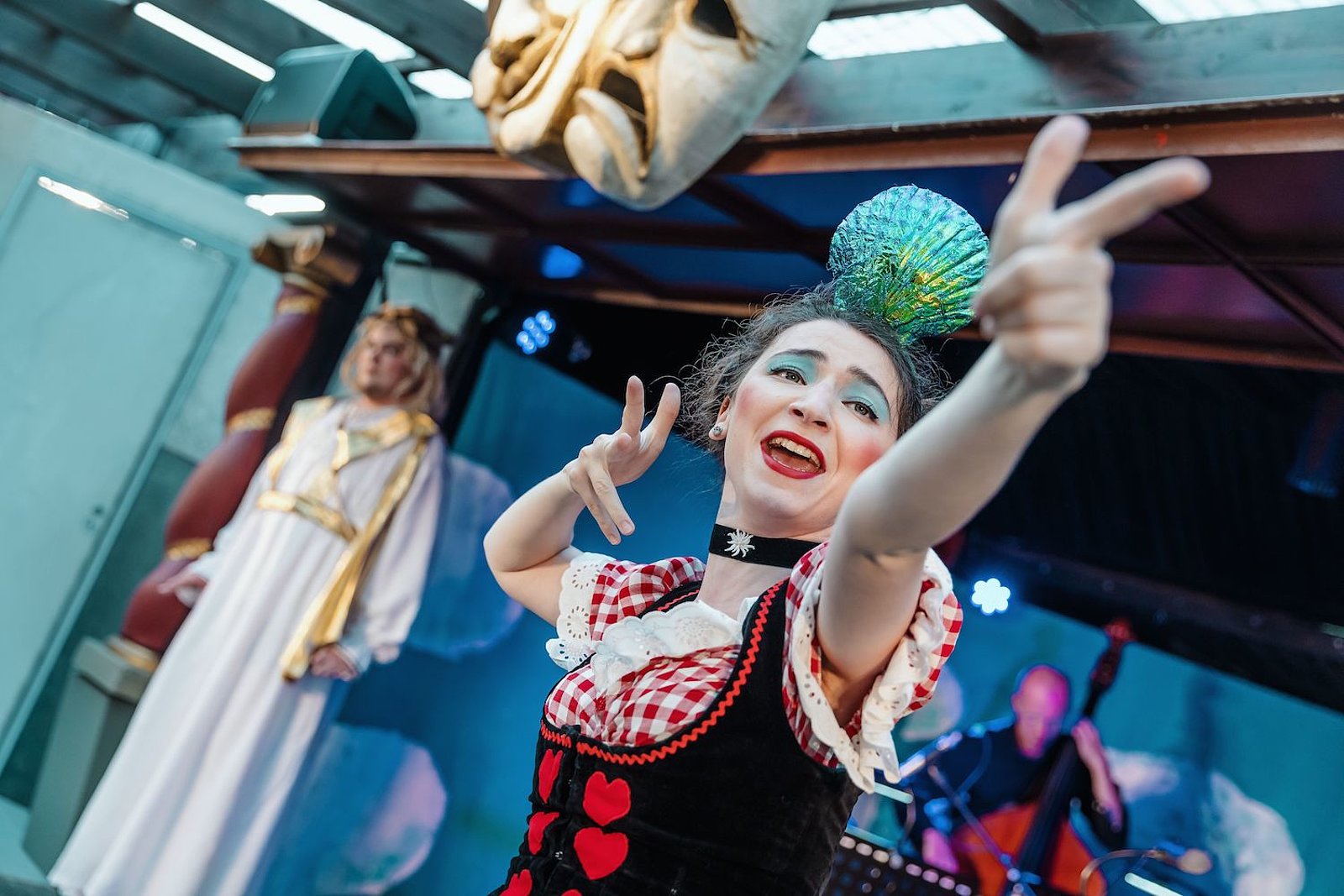 In voller Üppigkeit und vielleicht sogar runder konzeptionell ausgefeilt als die zehnte und elfte Version: Die Serkowitzer Volksoper präsentiert im Sommer 2022 »Dafne auf Naxos« in der Saloppe und führt uns dabei in ein Kulturhaus im Endzeitmodus in ostdeutscher Provinz. Dort hat ein Kulturhausleiter drei Probleme: Zum letzten Tag des Hauses sind zwei Produktionen zu Gast – eine fesche volkstümliche Operette, vermeintlich ausverkauft, und eine frühbarocke Ausgrabung einer »hochkulturell-verschrobenen«, also überaus ernsthaften Truppe, die auf der Studiobühne vor höchstens 45 Leuten gastieren soll.
