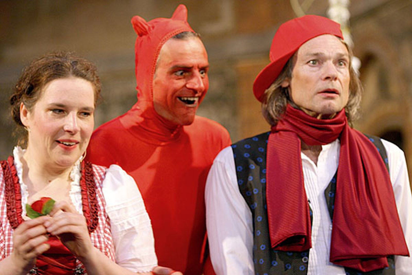Da sitzt er in Auerbachs Keller, der alte Dr. Faust, und grämt sich seines drögen Lebens. Gut, dass es den Alkohol gibt, denn der hochprozentige »Erdgeist« des Schankwirts bringt Schwung in die morschen Glieder und die Sehnsucht nach den wichtigen Dingen im Leben: berühmt werden, erfolgreich sein und bei der Oscar-Afterparty dralle Weiber … kennenlernen. Und Mephistopheles steht bereit, den berühmten Pakt zu schließen. Doch der Beelzebub (Martin Rosmanith) ist gar kein arger Teufel, wie er so knallrot daherkommt, sondern eher ein freundlicher Geist, der lieber Omas über die Straße hilft. Aber wenn der höllische Chef drängelt, muss eben des Fausts Seele im Sonderabo eingekauft werden. Und dabei wird nicht nur die Bühne der St. Pauli Ruine zur Kulisse.